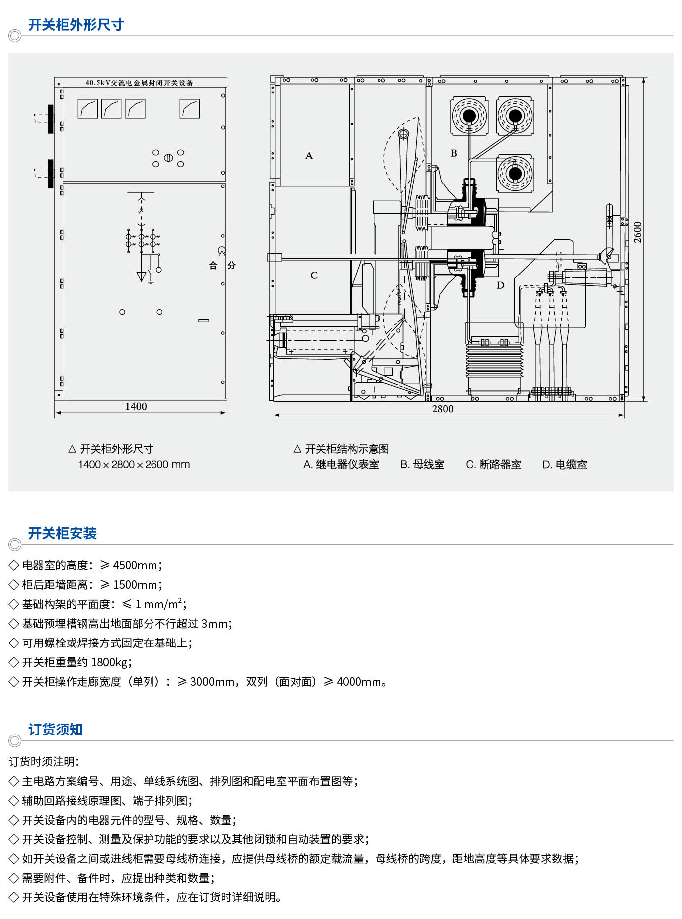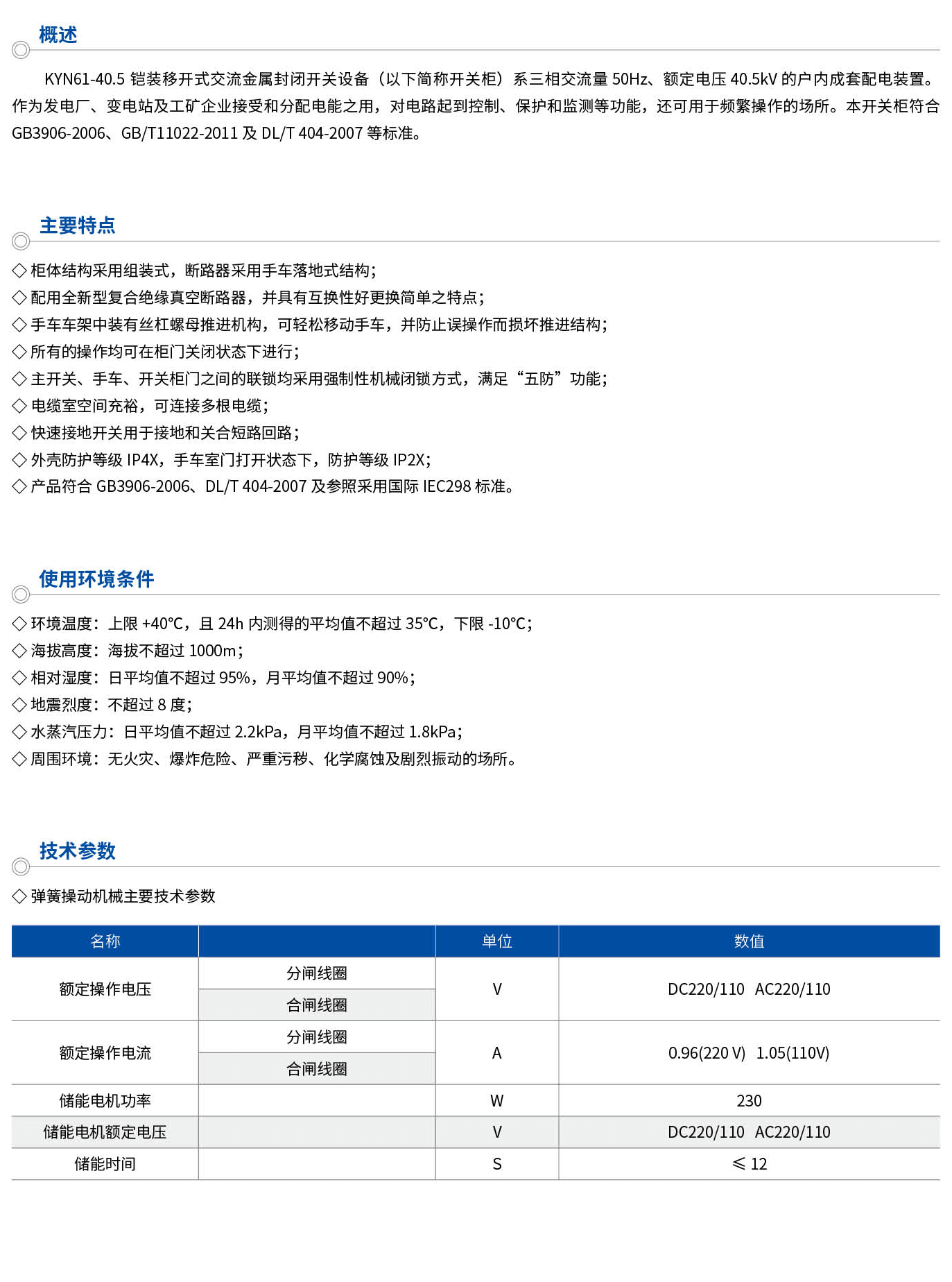 KYN61-40.5鎧裝移開式交流金屬封閉開關設備(以下簡稱開關柜)系三相交流量50Hz、額定電壓40.5kV的戶內成套配電裝置。作為發電廠、變電站及工礦企業接受和分配電能之用,對電路起到控制、保護和監測等功能,還可用于頻繁操作的場所。本開關柜符合GB3906-2006、GB/T11022-2011及DL/T404-2007等標準。