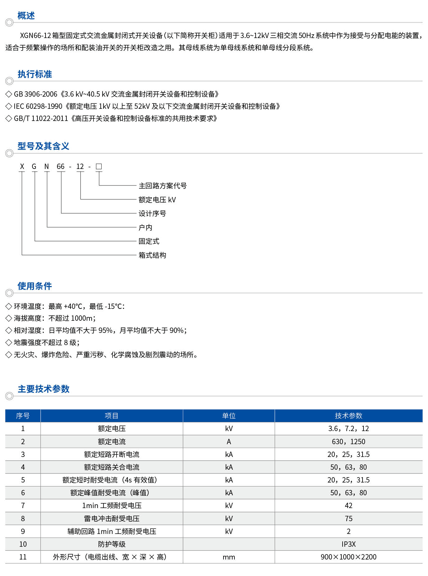 XGN66-12箱型固定式交流金屬封閉式開關(guān)設(shè)備(以下簡稱開關(guān)柜)適用于3.6~12kV三相交流50Hz系統(tǒng)中作為接受與分配電能的裝置,適合于頻繁操作的場所和配裝油開關(guān)的開關(guān)柜改造之用。其母線系統(tǒng)為單母線系統(tǒng)和單母線分段系統(tǒng)。