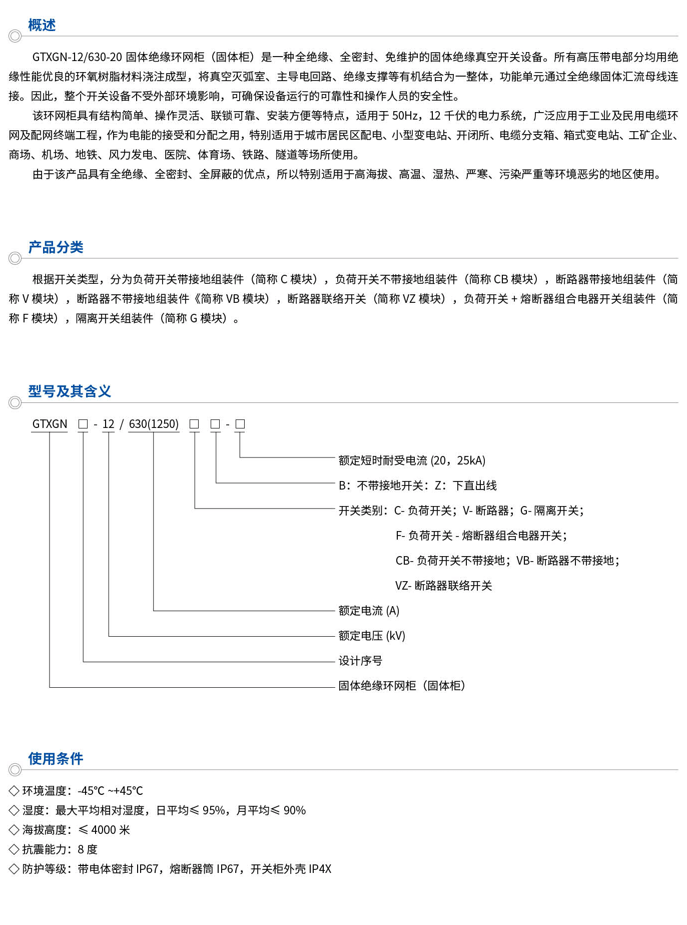 GTXGN-12/630-20固體絕緣環網柜(固體柜)是一種全絕緣、全密封、免維護的固體絕緣真空開關設備。所有高壓帶電部分均用絕緣性能優良的環氧樹脂材料澆注成型,將真空滅弧室、主導電回路、絕緣支撐等有機結合為一整體,功能單元通過全絕緣固體匯流母線連接。因此,整個開關設備不受外部環境影響,可確保設備運行的可靠性和操作人員的安全性。該環網柜具有結構簡單、操作靈話、聯鎖可靠、安裝方便等特點,適用于50Hz,12千伏的電力系統,廣泛應用于工業及民用電纜環網及配網終端工程,作為電能的接受和分配之用,特別適用于城市居民區配電、小型變電站、開閉所、電纜分支箱、箱式變電站、工礦企業、商場、機場、地鐵、風力發電、醫院、體育場、鐵路、隧道等場所使用。由于該產品具有全絕緣、全密封、全屏蔽的優點,所以特別適用···