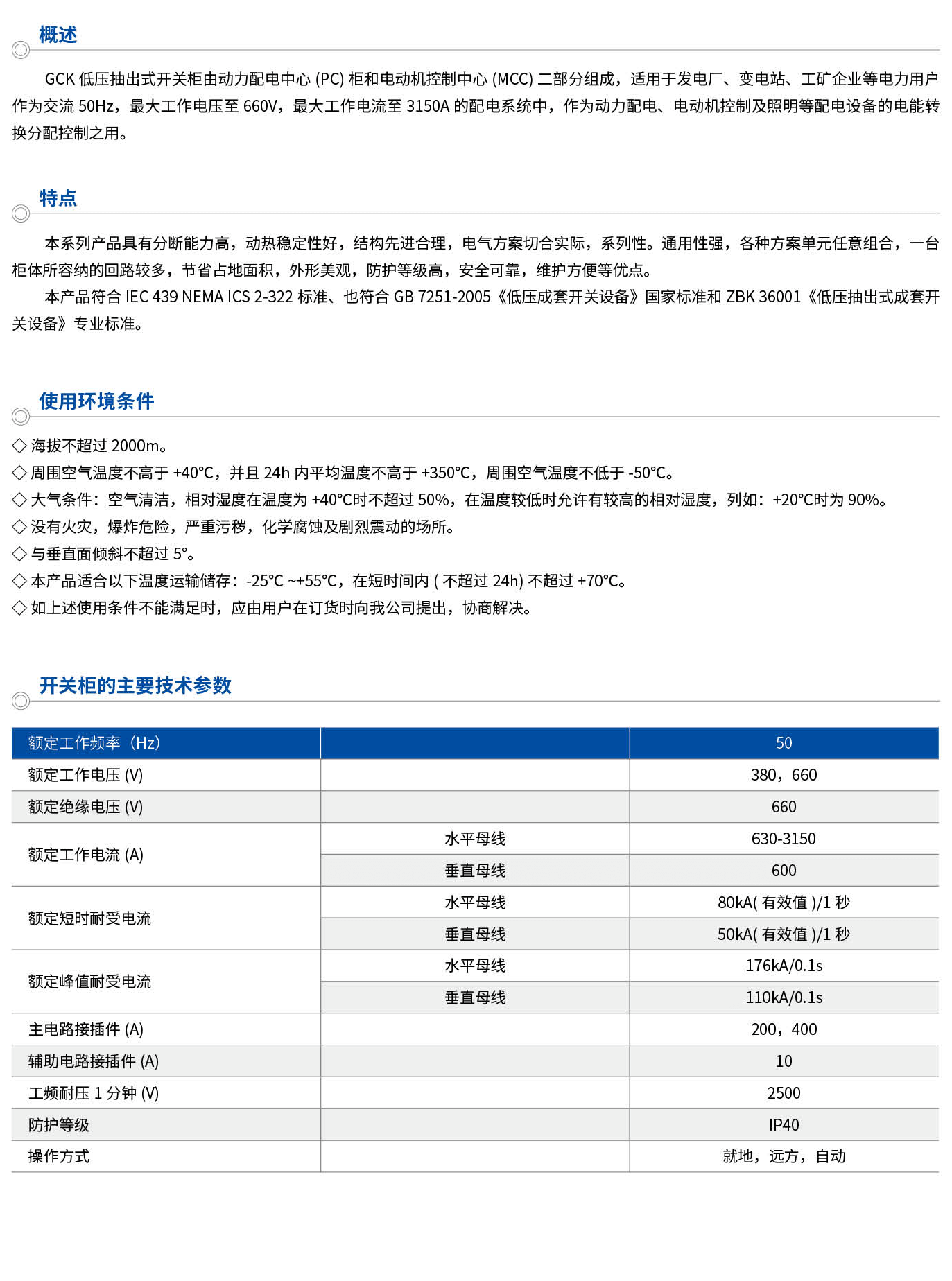 GCK低壓抽出式開關柜由動力配電中心(PC)柜和電動機控制中心(MCC)二部分組成,適用于發電廠、變電站、工礦企業等電力用戶作為交流50Hz,工作電壓至660V,工作電流至3150A的配電系統中,作為動力配電、電動機控制及照明等配電設備的電能轉換分配控制之用。