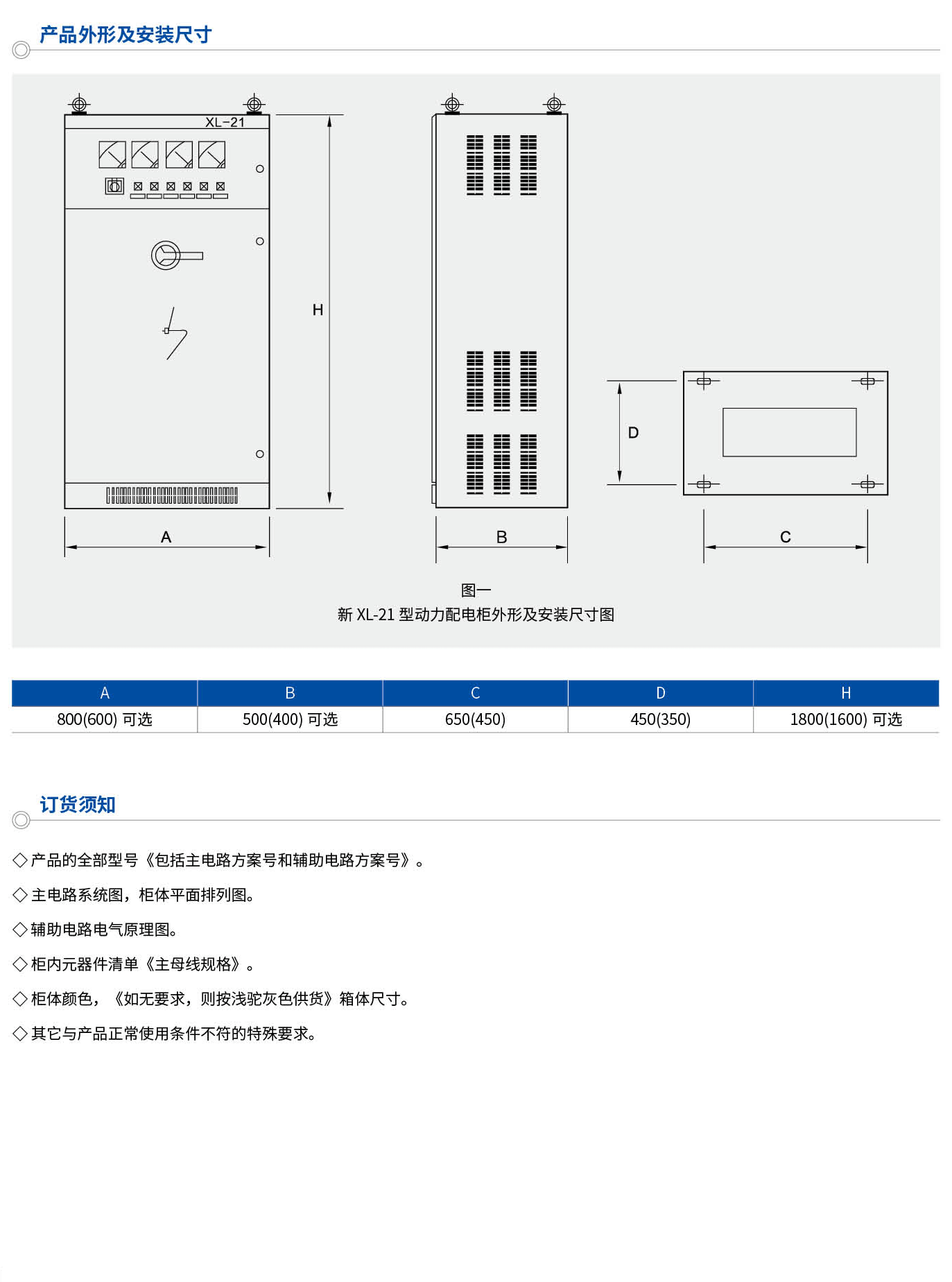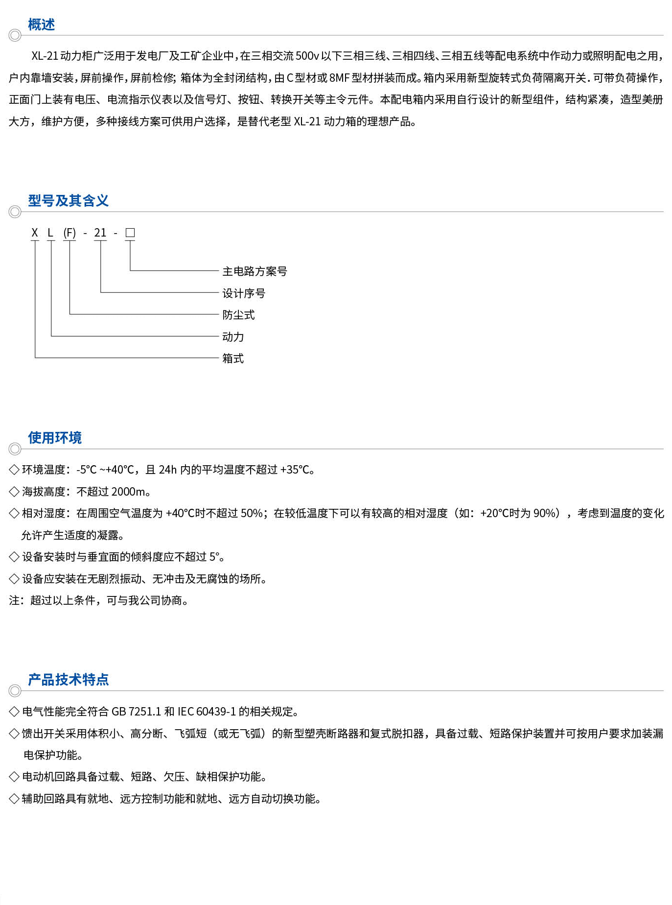 XL-21動(dòng)力柜廣泛用于發(fā)電廠及工礦企業(yè)中,在三相交流500以下三相三線、三相四線、三相五線等配電系統(tǒng)中作動(dòng)力或照明配電之用,戶內(nèi)靠墻安裝,屏前操作,屏前檢修;箱體為全封閉結(jié)構(gòu),由C型材或8MF型材拼裝而成。箱內(nèi)采用新型旋轉(zhuǎn)式負(fù)荷隔離開(kāi)關(guān).可帶負(fù)荷操作,正面門上裝有電壓、電流指示儀表以及信號(hào)燈、按鈕、轉(zhuǎn)換開(kāi)關(guān)等主令元件。本配電箱內(nèi)采用自行設(shè)計(jì)的新型組件,結(jié)構(gòu)緊湊,造型美冊(cè)大方,維護(hù)方便,多種接線方案可供用戶選擇,是替代老型XL-21動(dòng)力箱的理想產(chǎn)品。