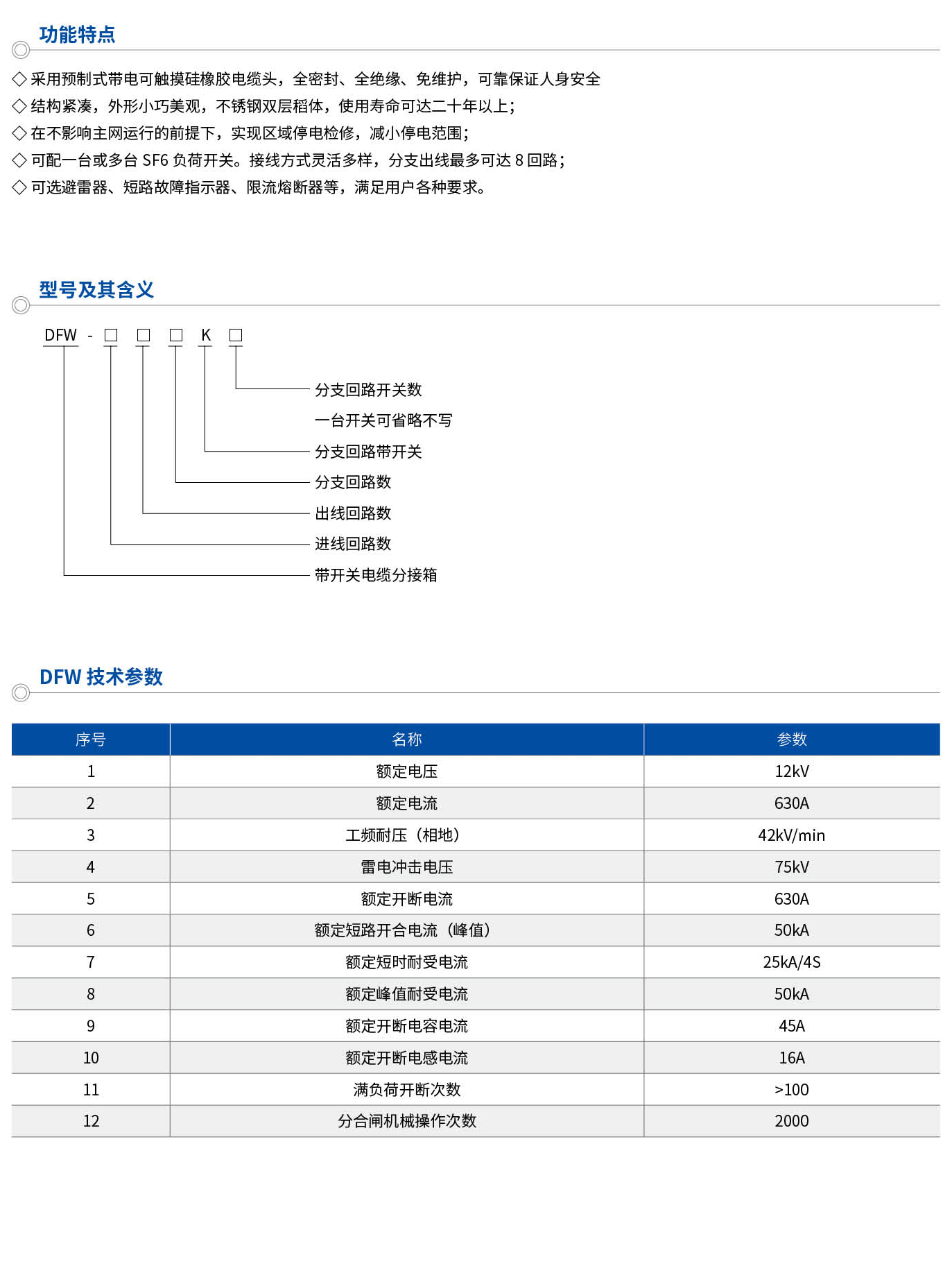 功能特點:采用預(yù)制式帶電可觸摸硅橡膠電纜頭,全密封、全絕緣、免維護,可靠保證人身安全。結(jié)構(gòu)緊湊,外形小巧美觀,不銹鋼雙層稻體,使用壽命可達二十年以上;在不影響主網(wǎng)運行的前提下,實現(xiàn)區(qū)域停電檢修,減小停電范圍;可配一臺或多臺SF6負荷開關(guān)。接線方式靈活多樣,分支出線可達8回路;可選避雷器、短路故障指示器、限流熔斷器等,滿足用戶各種要求。